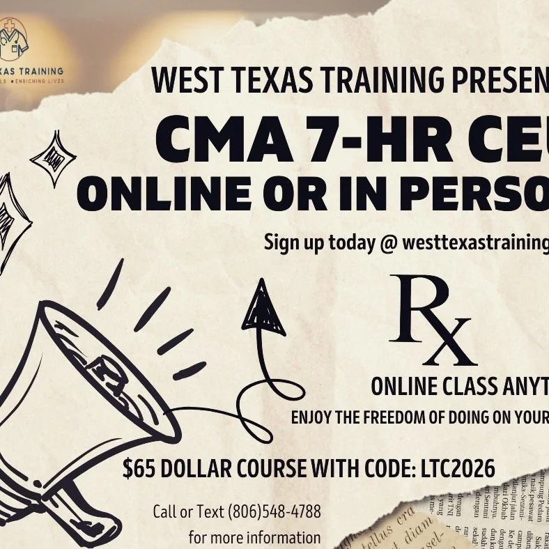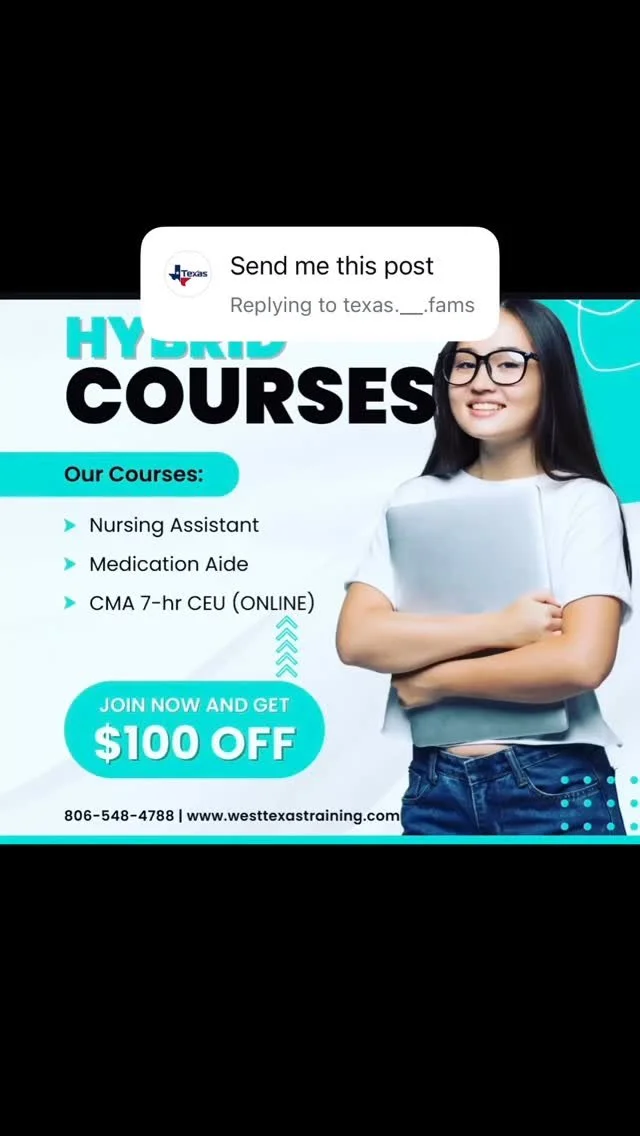 Get started on your journey to becoming a Certified Nursing Assistant with West Texas Training's comprehensive CNA training program. Our state approved curriculum-based training includes 60 hrs of classroom and simulation lab instruction, followed by 40 hrs of hands on clinical training in a long-term care facility. Enjoy the benefits of a hybrid program spending less dedicated hours in classroom. Gain valuable real-life experience and take the first step towards a rewarding career in healthcare. Acceleration available and fit to meet your school schedule. Our evening course is designed around the standards required by Texas Tech University school of nursing program.